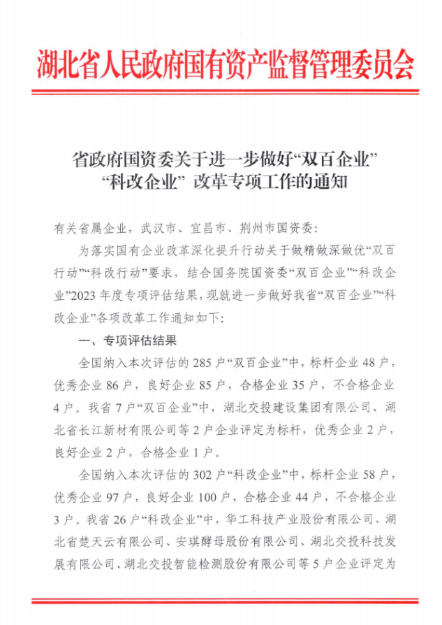 本次考核是國資委組織對地方所屬“科改”“雙百”企業(yè)年度改革創(chuàng)新情況開展的專項考核,湖北省納入本次考核的科改企業(yè)26戶,優(yōu)秀企業(yè)8戶。